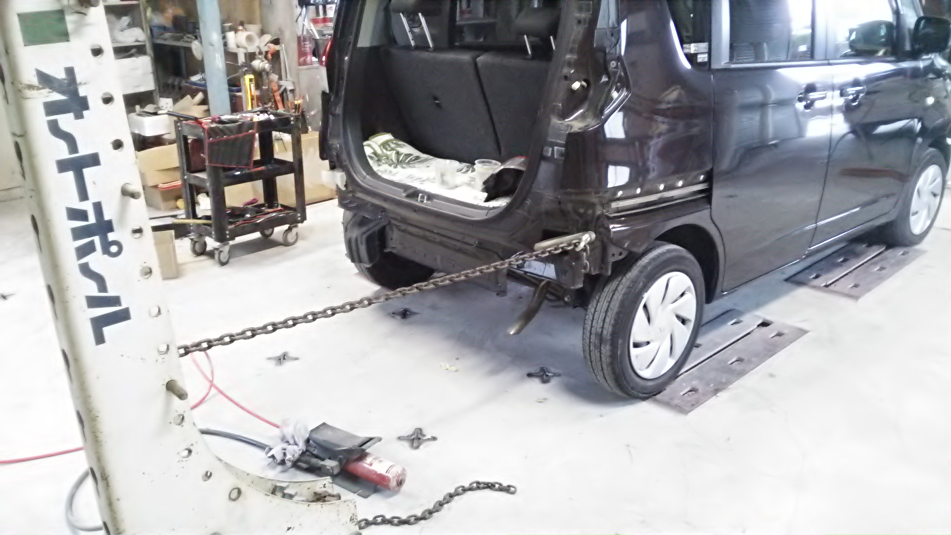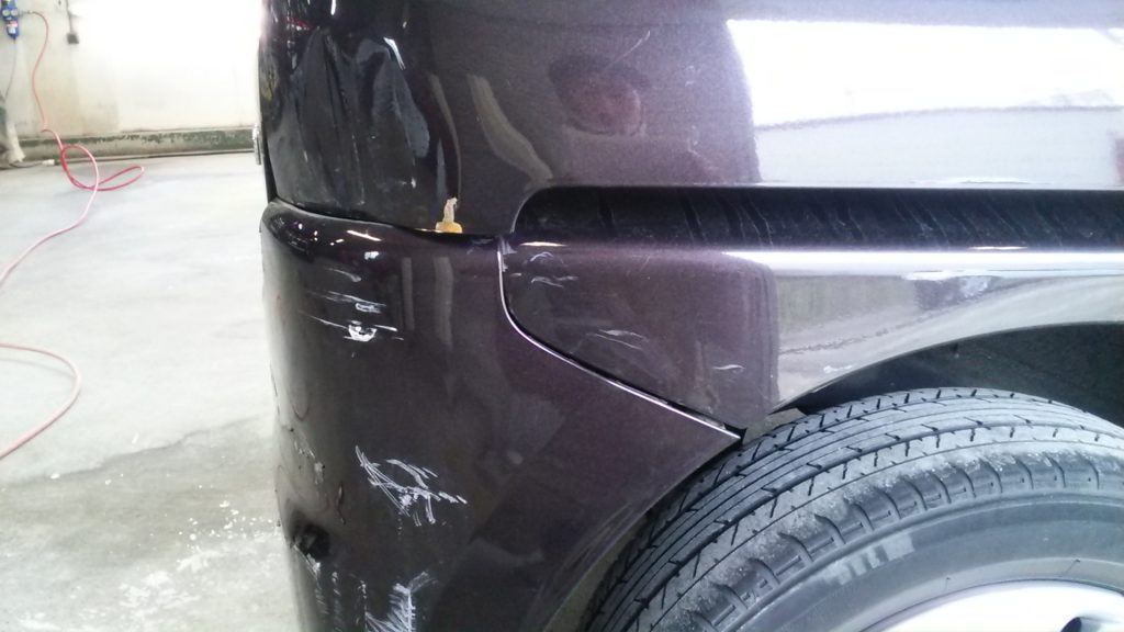 リヤバンパーを取り外して、ぶつかっている所を修正機でフックを掛け